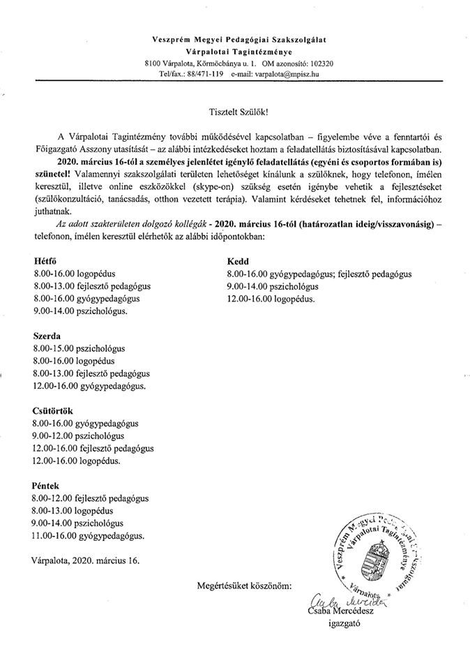 A Veszprém Megyei Pedagógiai Szakszolgálat Várpalotai Tagintézményének tájékoztatója – Várpalota város hivatalos oldala