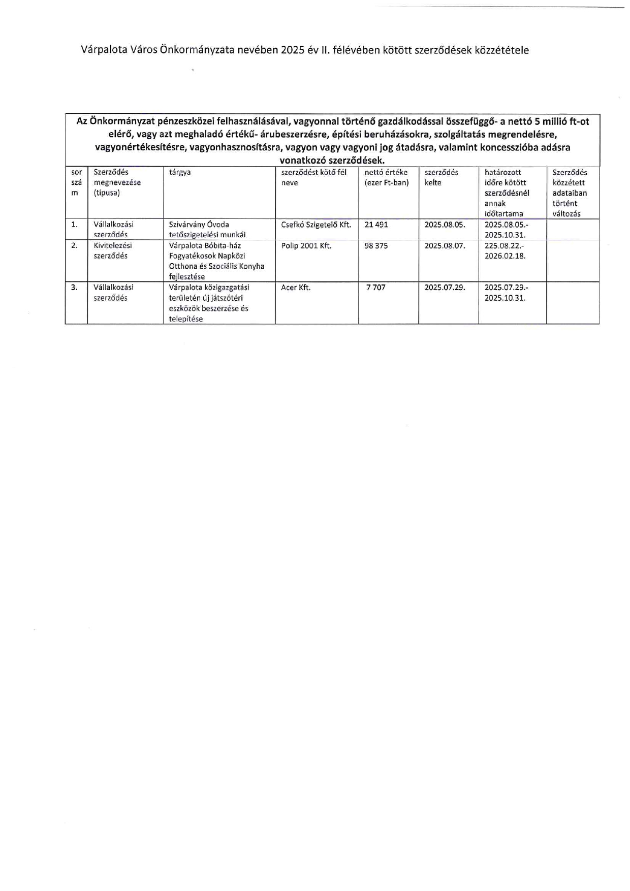 Az Önkormányzat nevében 2022. év II. félévében kötött szerződések