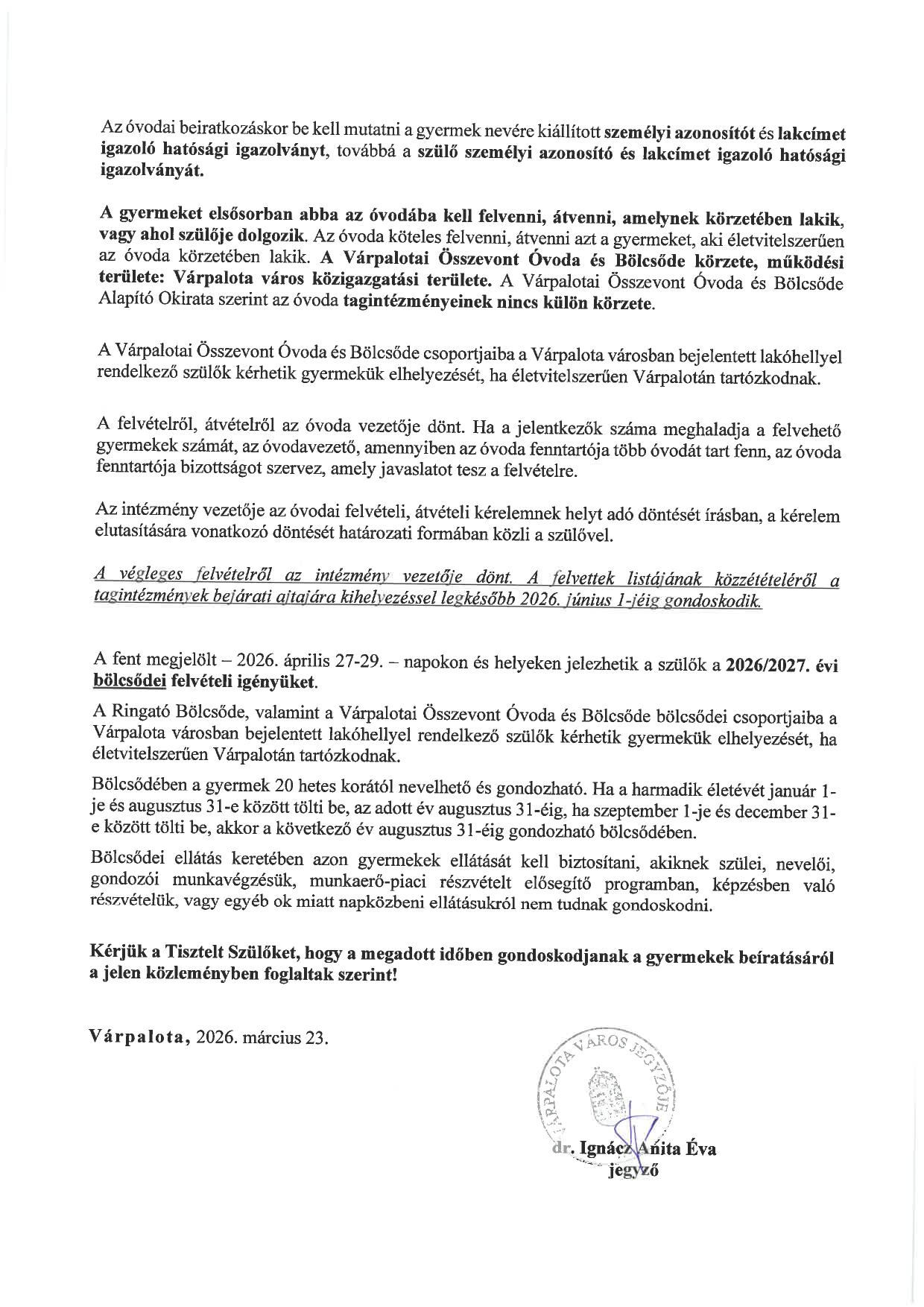 Közlemény – óvodai beíratásról – Várpalota város hivatalos oldala